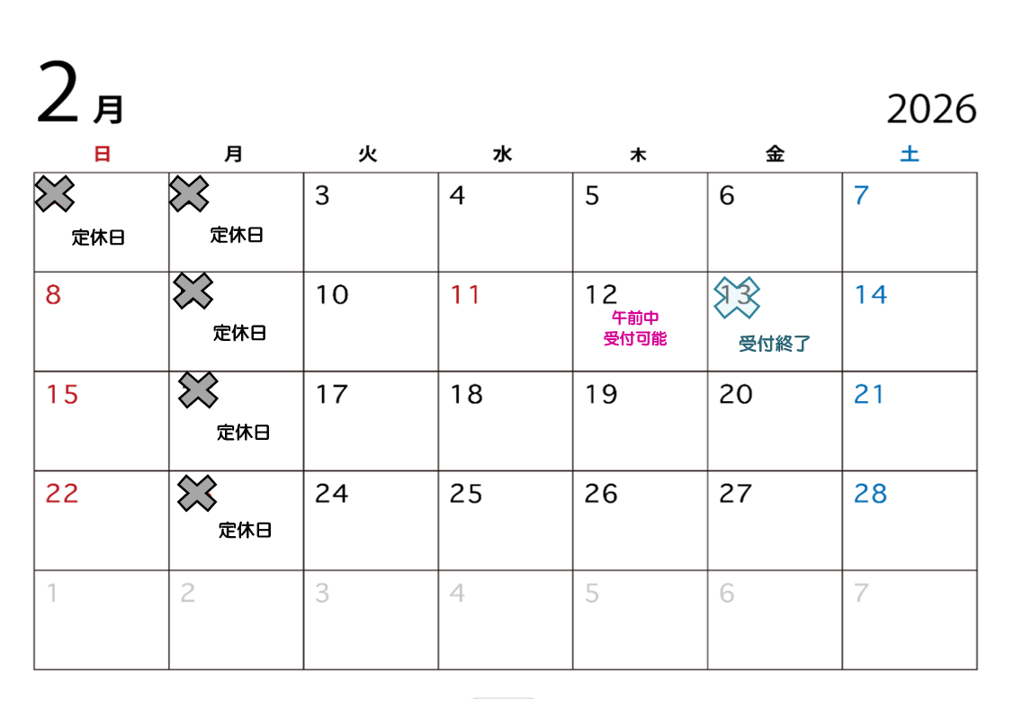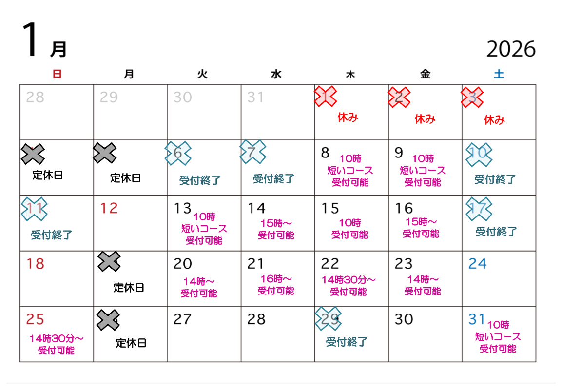 キャンセルなどで急きょご予約受付できる日もございますので、ご希望の際は一度ご連絡頂けると嬉しいです。