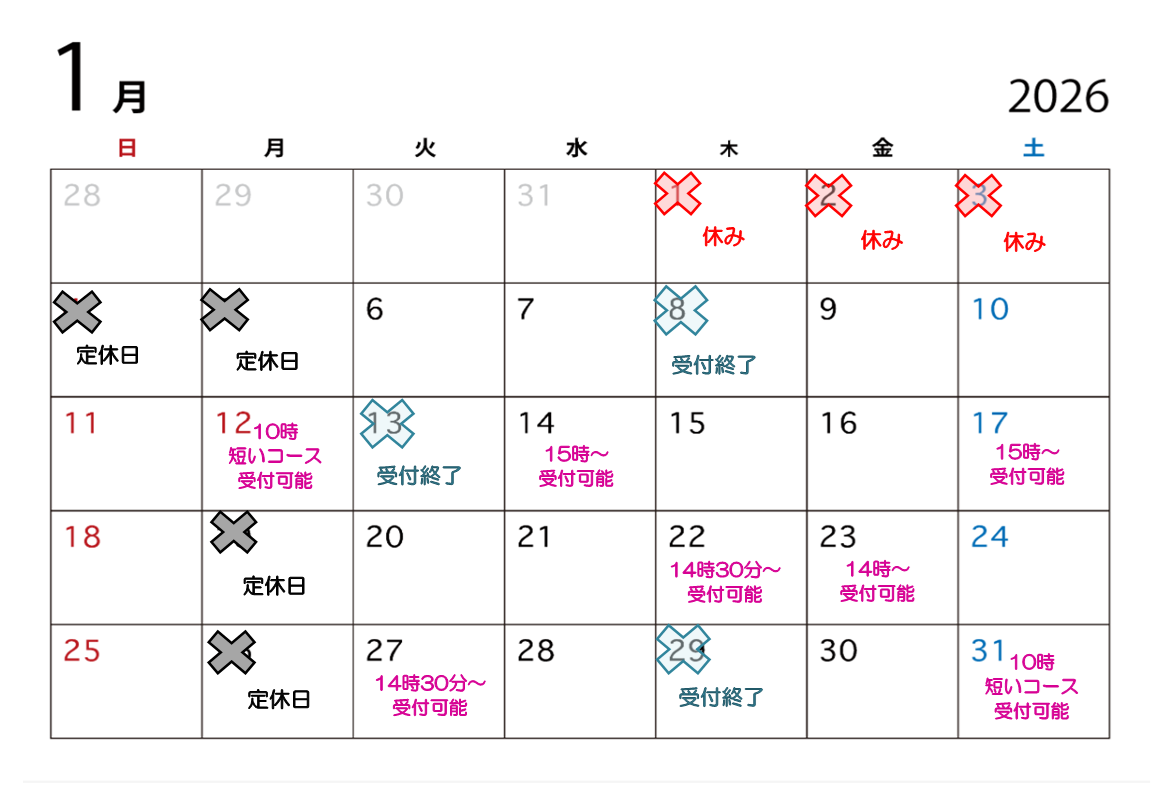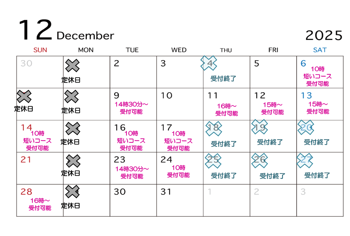 キャンセルなどで急きょご予約受付できる日もございますので、ご希望の際は一度ご連絡頂けると嬉しいです。