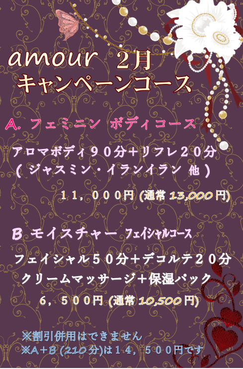 今月のボディコースは、女性性を生かしてくれるジャスミンやイランイランなどの精油を含めた贅沢なコースをご用意いたしました。