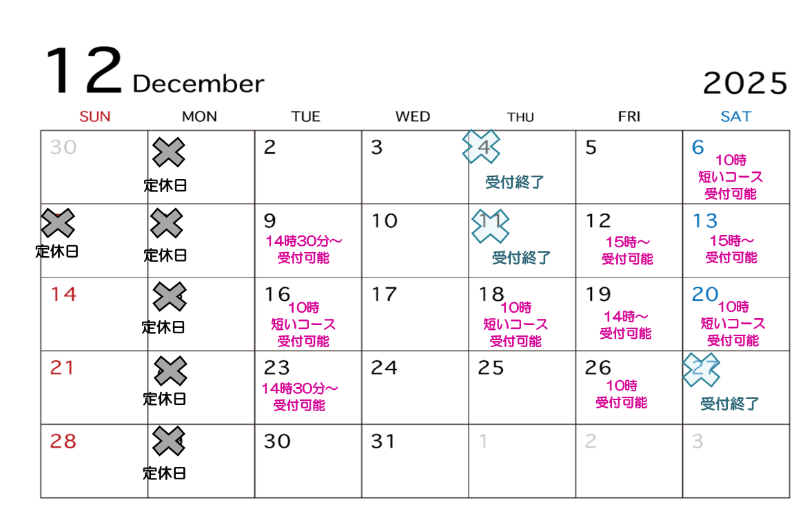 キャンセルなどで急きょご予約受付できる日もございますので、ご希望の際は一度ご連絡頂けると嬉しいです。