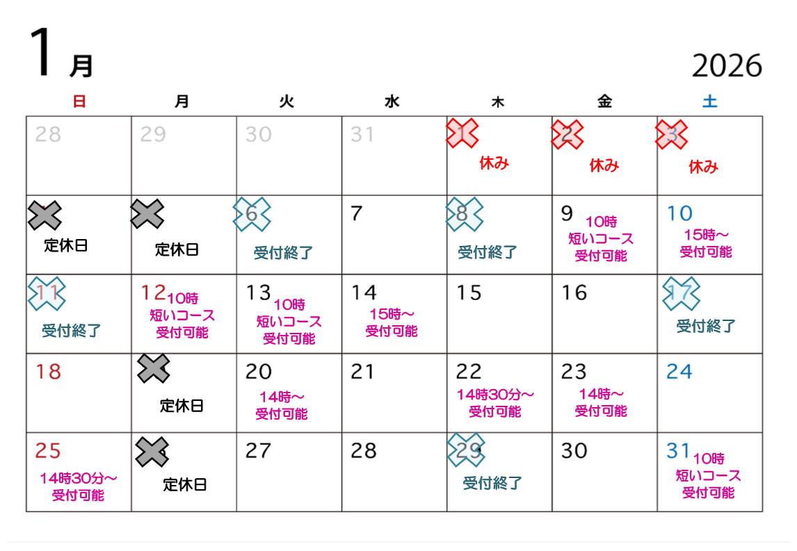 キャンセルなどで急きょご予約受付できる日もございますので、ご希望の際は一度ご連絡頂けると嬉しいです。